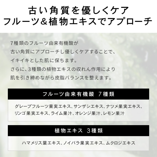 水、BG、マルチトール、ソルビトール、ココイルグリシンK、ベントナイト、ラウロイルメチルアラニンNa、乳酸桿菌/セイヨウナシ果汁発酵液、グリチルリチン酸2K、グレープフルーツ果実エキス、サンザシエキス、ナツメ果実エキス、リンゴ果実エキス、ライム果汁、オレンジ果汁、レモン果汁、ハマメリス葉エキス、ノイバラ果実エキス、ムクロジエキス、ベルガモット果実油、マンダリンオレンジ果皮油、ローズマリー油、塩化Na、EDTA-2Na、水酸化K、ココアンホ酢酸Na、コカミドプロピルベタイン、フェノキシエタノール
