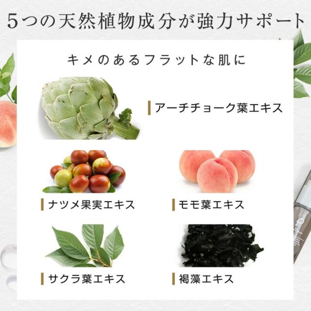 水、BG、グリセリン、DPG、ベタイン、パルミチン酸アスコルビルリン酸3Na、ヒアルロン酸Na、アーチチョーク葉エキス、ナツメ果実エキス、モモ葉エキス、ソメイヨシノ葉エキス、ヒバマタエキス、カルボマー、キサンタンガム、メチルパラベン、グリチルリチン酸2K、水酸化K