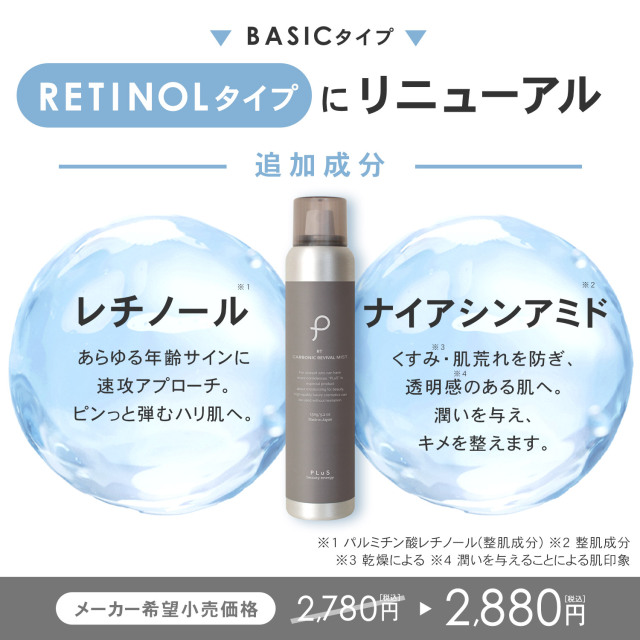 水、BG、グリセリン、二酸化炭素、温泉水、ヒアルロン酸Na、加水分解ヒアルロン酸、パルミチン酸レチノール、ナイアシンアミド、リン酸アスコルビルMg、テトラヘキシルデカン酸アスコルビル、プラセンタエキス、メマツヨイグサ種子エキス、ダイズ種子エキス、アルニカ花エキス、セイヨウオトギリソウ花/葉/茎エキス、セイヨウキズタ葉/茎エキス、セイヨウトチノキ種子エキス、ハマメリス葉エキス、ブドウ葉エキス、フラーレン、PVP、セレブロシド、パンテノール、スクワラン、ピーナッツ油、PEG-60水添ヒマシ油、クエン酸、クエン酸Na、オレンジ油、ラベンダー油、リナロール、ゲラニオール、キサンタンガム、水添レシチン、ソルビトール、トコフェロール、エタノール、フェノキシエタノール、メチルパラベン、プロピルパラベン