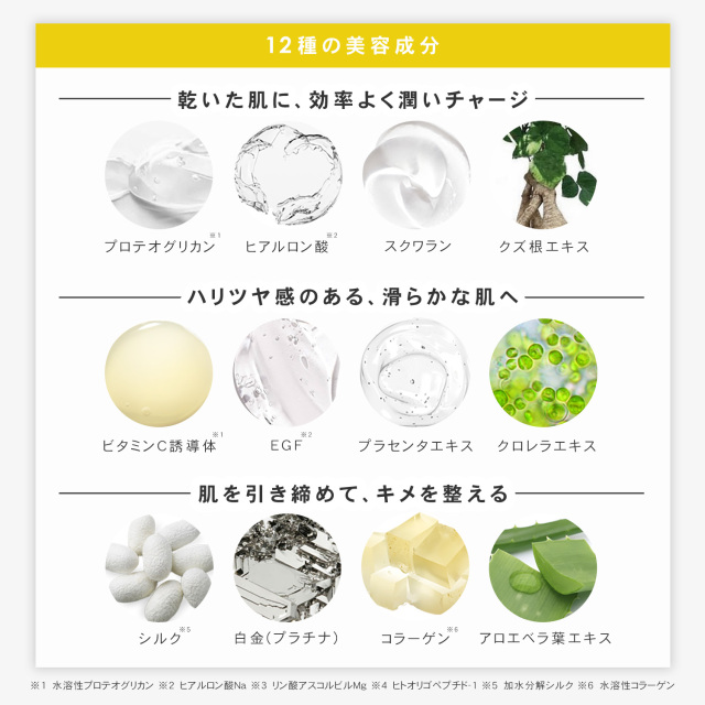 水、DPG、グリセリン、BG、リン酸アスコルビルMg、加水分解シルク、プラセンタエキス、水溶性プロテオグリカン、スクワラン、白金、ヒアルロン酸Na、水溶性コラーゲン、アロエベラ葉エキス、クロレラエキス、クズ根エキス、ヒトオリゴペプチド-1、ベルガモット果皮油、グレープフルーツ果皮油、ハッカ葉油、メントール、ポリソルベート80、PEG-60水添ヒマシ油、キサンタンガム、マンニトール、エチルヘキシルグリセリン、アニス酸Na、クエン酸、クエン酸Na、カプリロイルグリシン、フェノキシエタノール