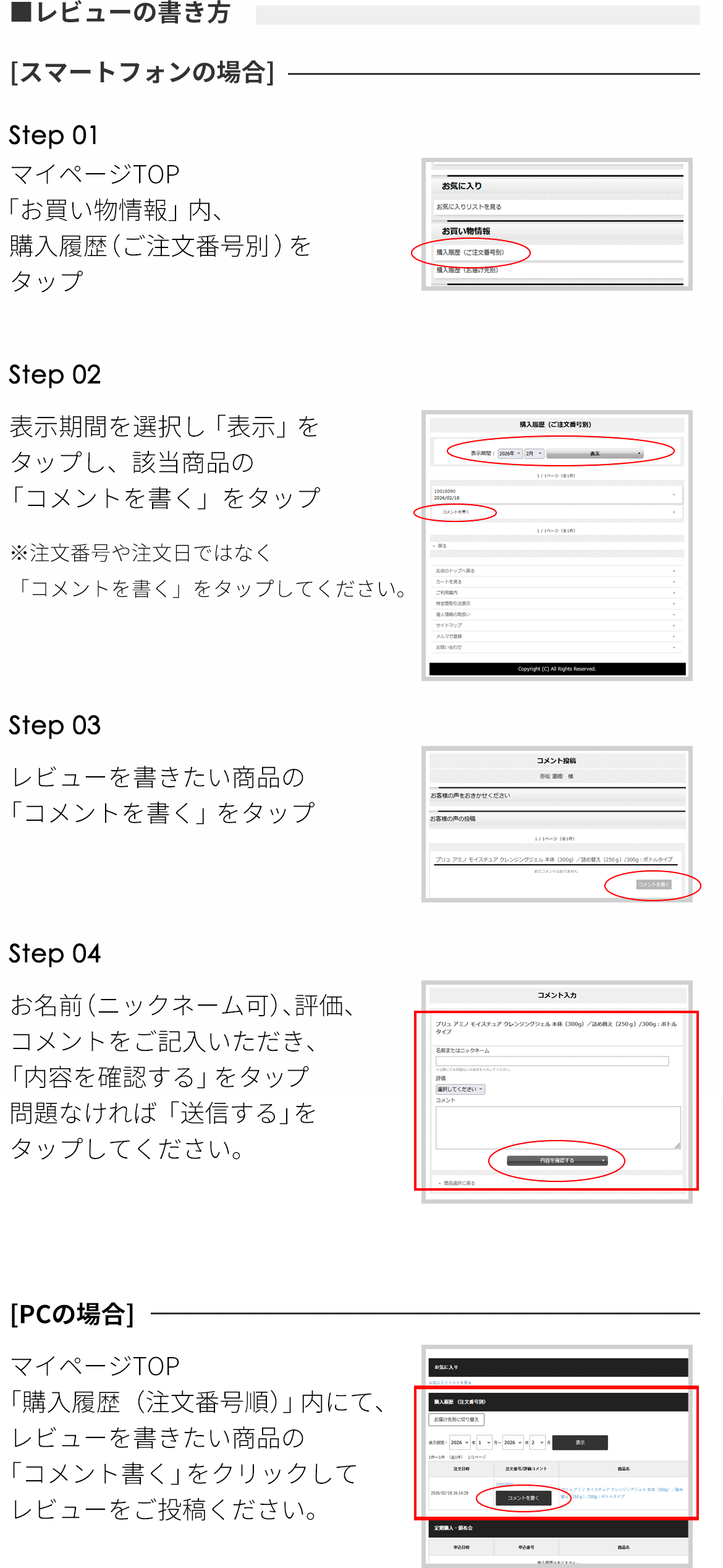 コメント(レビュー)は商品ごとに投稿できますが、複数の商品を同時に購入し、すべての商品にレビューを投稿した場合でも、ポイントの発行は 1 注文に対して 1 回のみの付与となります